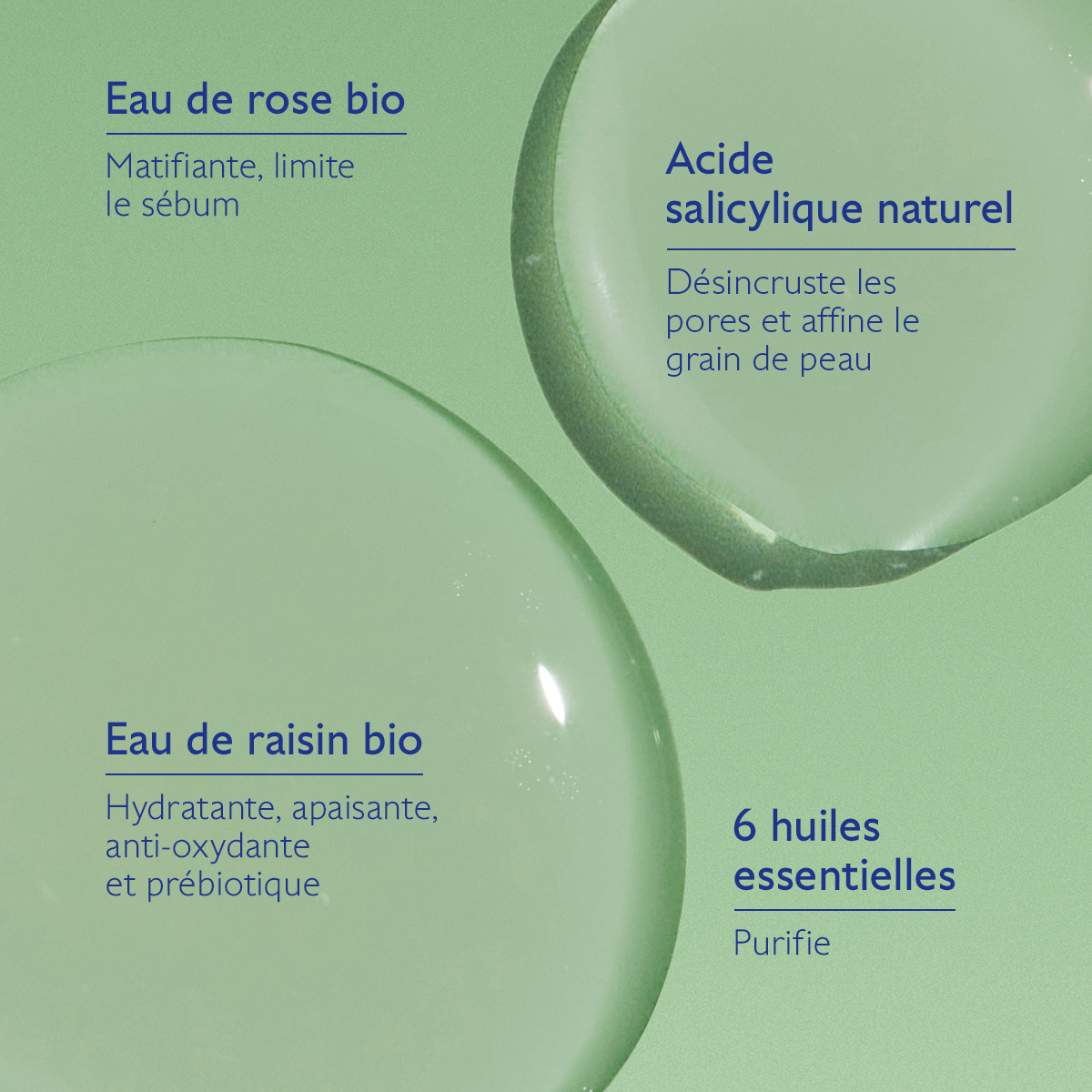 | Ingrédients clés : | Acide salicylique naturel, huiles essentielles purifiantes, eau de raisin bio |