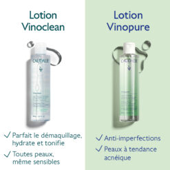 | La Lotion Vinoclean, sans alcool, parfait le démaquillage, hydrate et tonifie tous les types de peau. La Lotion Vinopure réduit l’apparence des imperfections des peaux à tendance acnéique. | |