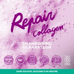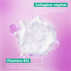 - Réparation express : Le collagène végétal comble les fissures de la fibre, lisse les écailles et renforce l’élasticité.
