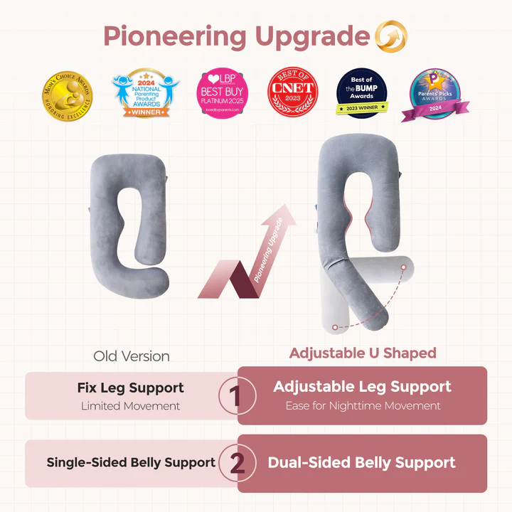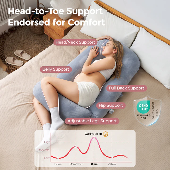 Évolution du coussin de grossesse en forme de U traditionnel, le coussin U Pro de Momcozy intègre un repose-jambe coulissant innovant, permettant d’ajuster l’angle ou de le replier facilement. Vous bougez plus librement pendant la nuit, sans avoir à enjamber des rebords fixes.
