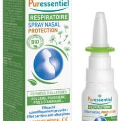 Puressentiel Respiratoire Spray Nasal Protection Allergies 15 ml est un spray qui forme un film protecteur anti-allergènes environnementaux et végétaux présents dans l’air et sur les tissus. Il prévient ainsi les symptômes de la rhinite allergique : éternuements, écoulement, obstruction et démangeaisons nasales, fatigue respiratoire. Il humidifie et préserve l’hydratation naturelle de la muqueuse nasale, de manière sûre et efficace.